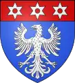 - D'azur à l'aigle d'argent au chef cousu de gueules, chargé de trois molettes d'argent (allias de trois étoiles d'or)[1]