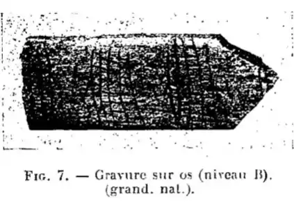 L'image ci-dessous (fig. 4) montre un os gravé dont la base porte des encoches : selon Saint-Périer, sur l'une des faces (figure n° 1, dessin du haut) est représentée une tête d'animal vue de face (une tête d'ours selon lui) encadrée par deux traits figurant des flèches, et un poisson ; sur l'autre face (fig. n° 2, dessin du bas), une tête de cheval vue de profil ; le corps du cheval est en vue fuyante et se termine de façon indistincte ; au-dessus, une tête d'animal (antilope saïga selon Saint-Périer) : front bombé, œil très haut dans la face, début du mufle et grande corne annelée. Niveau A (Magdalénien final ou début Azilien).