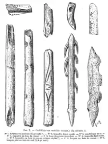 - 1 : gravure de poisson (Cyprinidé ?) • 2 : baguette demi-ronde • 3 : pendeloque en os • 4 : baguette en bois de renne • 5 : base de pointe fourchue • 6 : baguette demi-ronde • 7 : baguette en bois de renne (oiseau stylisé ?) • 8 : harpon en bois de renne • 9 : harpon plat en bois de renne