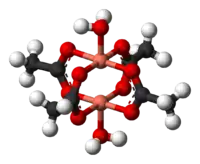 L'acétate de cuivre hydraté adopte une structure en « roue à aubes » que l'on rencontre aussi chez les tétraacetétes de Rh(II) et Cr(II) [3],[4]. Un atome d'oxygène de groupe acétate est lié a un atome de cuivre formant une liaison de 197 pm. Deux ligands d'eau complètent la sphère de coordination, avec une distance Cu–O de 220 pm. Les deux atomes de cuivre pentacoordinés sont séparés par une distance de 262 pm, proche de la distance Cu–Cu dans le cuivre métallique[5]. les deux centres de cuivre interagissent, ce qui réduit le moment magnétique, si bien que vers −183,15 °C, Cu2(OAc)4(H2O)2 est essentiellement diamagnétique du fait de l'auto-annulation des deux spins opposés. L'étude de Cu2(OAc)4(H2O)2 marque une étape importante dans le développement des théories modernes sur le couplage antiferromagnétique[6].
