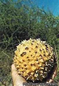 La plante se présente sous la forme d’un buisson épineux d’un mètre de hauteur, produisant des melons sphériques, comestibles à maturité, couverts de protubérances coniques.
