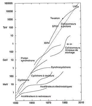 Dans le passé, on gagnait un facteur 10 tous les 7-8 ans dans l'énergie des collisions réalisées. Si l'évolution s'était maintenue, 60 TeV aurait été atteint dès 2005. Le Large Hadron Collider (LHC) (7 TeV + 7 TeV, CERN, 2008) ne suit donc pas l'extrapolation. Il y a donc un net fléchissement des performances qui indique peut-être un premier signe de fatigue de la discipline[6].