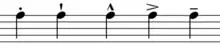 - ˘ : avec un signe bref au-dessus de la tête de note, indiquant qu'elle doit être jouée légèrement plus doucement que les notes voisines.