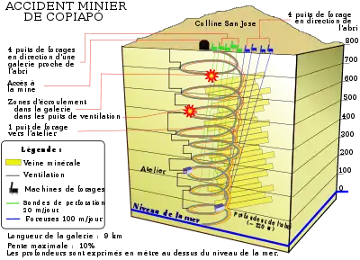 Le plan de sauvetage est conçu par des ingénieurs de l'entreprise de l'État chilien Codelco[4],[5],[6] dirigés par l'ingénieur André Sougarret[7],[8], avec l'aide de l'entreprise texane Drillers Supply International et le forage du puits de secours effectué par Center Rock, une entreprise du comté de Somerset (Pennsylvanie)[9], est terminé le [10]. Il a fallu 33 jours de forage pour atteindre les 33 mineurs[11]. Le premier mineur, Florencio Avalos, est remonté à la surface grâce à une étroite capsule, semblable à une Dahlbusch Bomb (en), baptisée Fenix 2 (Phénix en français, par allusion à la « renaissance » des mineurs extraits de la mine) le mercredi , vers 0 h 12[12], heure locale, après 69 jours passés coupés du monde à près de 700 mètres sous terre. Le 33e et dernier mineur, Luis Urzúa, rejoint finalement la surface à 21 h 55, heure locale. La capsule Fenix 2 fut principalement réalisée en métal déployé[13].