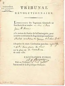 C'est par le décret du qu'est créé le tribunal révolutionnaire et la nomination d'un accusateur public ainsi que de ses deux substituts auprès de ce tribunal. Louis-Joseph Faure est le premier accusateur public nommé, mais il préfère renoncer à ce poste, c'est Fouquier-Tinville qui le remplace.