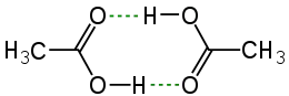 La structure cristalline de l'acide acétique[31] montre que les molécules se mettent par deux en dimères connectés par des liaisons hydrogène. Ces dimères peuvent aussi être observés sous forme gazeuse à 120 °C. Ils sont probablement également présents dans la phase liquide de l'acide acétique pur, mais sont rapidement brisés à la moindre présence d'eau. Cette dimérisation existe chez d'autres acides carboxyliques. Elle a également lieu en solution aqueuse avec une constante d'association KD dont la valeur est proche de 1[32].