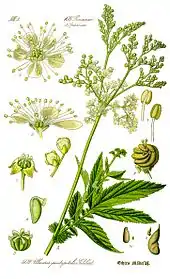 - Le terme d'aspirine a été forgé pour distinguer de l'acide acétylsalicylique naturel, extrait des fleurs de la reine-des-prés ou spirée ulmaire (à l'époque, le nom latin binomial de cette plante était Spiraea ulmaria), d'où le nom d'acide spirique dont la structure est équivalente à l'acide salicylique extraite de l'écorce du saule (Salix alba).