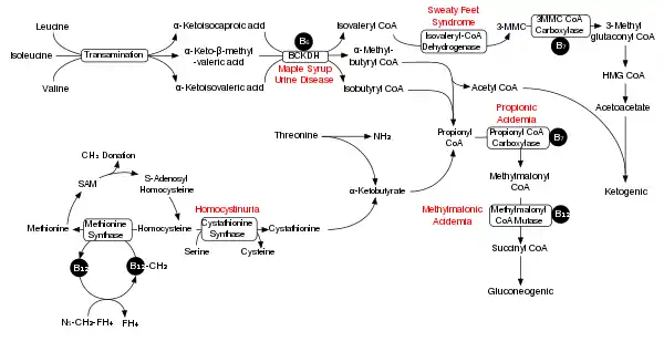 La dégradation des acides aminés ramifiés implique la production d'acides tricarboxyliques[6]. Elle implique le complexe 3-méthyl-2-oxobutanoate déshydrogénase. Une déficience de ce complexe induit une accumulation des BCAA et de leurs sous-produits toxiques dans le sang et l'urine, une affection rare d'origine génétique que l'on appelle maladie du sirop d'érable.