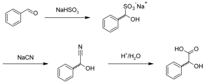 L'acide mandélique est en général préparé par l'hydrolyse en milieu acide du mandélonitrile[5] qui est la cyanhydrine du benzaldéhyde. Le mandélonitrile peut être préparé par réaction entre le benzaldéhyde et le bisulfite de sodium ; l'adduit ainsi obtenu est mis à réagir avec le cyanure de sodium pour former le mandélonitrile qui est ensuite hydrolysé[6] :