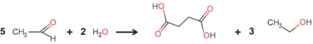 L’acide succinique entre également dans la composition du vin et du vinaigre et est toujours obtenu lors de la fermentation alcoolique du sucre en petites quantités, environ 1 g pour 100 g d’alcool. La formation d'acide succinique et de butane-2,3-diol à partir d’éthanal (acétaldéhyde) peut se résumer de la façon suivante :