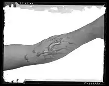 Le premier à le signaler est, semble-t-il, Gérard Dorn, un disciple de Paracelse, dans Congeries paracelsicae chemiae de transmutationibus metallorum, 1581, p. 144. L'idée prend corps chez Basile Valentin ; des gravures en ce sens se trouvent dans l'édition 1653 de l' Azoth de Basile Valentin (paru en 1624). On trouve l'emblème chez Johann Neithold Aureum Vellus; oder Güldenes Vleiss, Frankfurt (1733), mais, avant, sur le frontispice de l'édition de 1613 de La Toyson d'Or par Salomon Trismosin[32] ,[33]. Dans son Testament (1651), Basile Valentin écrit ceci :