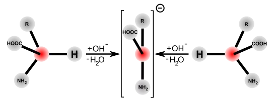 De grandes quantités d'acides aminés D peuvent provenir d'acides aminés L par racémisation. La formation d'un racémique d'acides aminés, c'est-à-dire d'un mélange à parties égales d'acides aminés D et L, est privilégiée thermodynamiquement. Certes, l'enthalpie reste inchangée, mais le degré supérieur de « désordre » conduit à une augmentation de l'entropie, ce qui amène une diminution de l'enthalpie libre G de ΔG. La valeur de cette décroissance est de -1,6 kJ/mole à 25 °C[14].