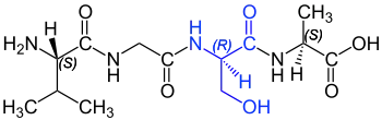 Dans les séquences d'acides aminés, les acides aminés D sont notés dans l'abréviation à 3 lettres par un préfixe D en petite capitale.