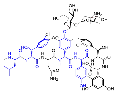 Un grand nombre d'antibiotiques peptidiques sont construits à partir d'acides aminés D. Ce sont des substances naturelles, fabriquées par des procaryotes au moyen de synthèses non-ribosomiques[31]. Le groupe très important du point de vue pharmacologique des pénicillines contient comme élément de structure élémentaire la D-pénicillamine, un acide aminé non protéinogène. Les polymyxines et les actinomycines sont aussi construites autour d'acides aminés D (respectivement D-phénylalanine et D-valine). La bacitracine produite par le Bacillus subtilis consiste notamment d'aspartate, de glutamate, d'ornithine et de phénylalanine en configuration D. La valinomycine produite par Streptomyces fulvissimus contient de la D-valine, et la circuline A formée par le bacillus circulans contient de la D-leucine. Parmi les antibiotiques à acides aminés D, on compte encore notamment : la fongisporine (D-phénylalanine et D-valine), la gramicidine et la tyrocidine (D-phénylalanine), la malformine C (D-leucine et D-cystéine ), la mycobacilline (D-aspartate et D-glutamate)[34].