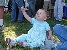 Vers trois mois, les gazouillis du nourrisson deviennent plus complexes. Vers six mois, des syllabes du type consonne-voyelle sont répétées, comme « ma-ma-ma-ma ». Cette production orale pré-linguistique est appelée le babillage[7]. Tous les enfants de six mois babillent de manière relativement similaire quel que soit leur environnement linguistique. Ce babillage est observé également chez les enfants sourds[7].