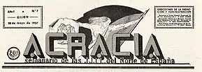 En 1887, au congrès de la Fédération régionale espagnole de l'Association internationale des travailleurs, un Manifeste est adopté et publié dans le journal El Productor : « Nous proclamons l'acratie et nous aspirons à un régime économico-social dans lequel, par l'accord des intérêts et la réciprocité des droits et des devoirs tous seront libres, tous contribueront à la production et jouiront du plus grand bonheur possible, qui consiste en ce que les produits consommés soient le fruit du travail de chacun, sans exploitation, et par conséquent sans les malédictions d'aucun exploité. »[16],[17]