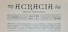 La paternité du néologisme Acracia est parfois attribuée à Rafael Farga i Pellicer[13] (1844-1890), militant syndicaliste catalan. En 1886-1888, Pellicer utilise l'expression dans des articles publiés dans Acracia, journal qu'il a fondé à Barcelone avec Anselmo Lorenzo[14]. Entre janvier et , il y publie une série de textes titrés « Acratismo societario »[15].