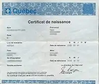 Les gens qui naissent dans la province de Québec reçoivent un certificat de naissance, créé à partir de l'acte. Le certificat de naissance est le document qui est généralement utilisé pour prouver la citoyenneté et l'identité. Les gens qui résident au Québec, ou qui ont des actes conservés à l'état civil québécois, peuvent demander que ces actes, considérés comme semi-authentiques, soient intégrés au registre de l'état civil. Les équivalents anglais des termes « acte de naissance » et « certificat de naissance » dans le droit québécois sont respectivement act of birth et birth certificate[23].