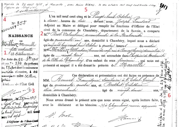 Dans les marges de la page figurent ce que l'on désigne sous le nom de « mentions marginales », à savoir des informations relatives à d'autres actes d'état civil de l'intéressé, cette mesure de publicité permettant d'établir un lien entre deux actes d'état civil ou entre un acte et un jugement. Ces mentions marginales, absentes sous l'Ancien Régime, sont apparues avec le Code civil[6].