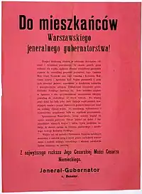 Le , à Varsovie, le gouverneur général, Hans Hartwig von Beseler, annonce solennellement, au nom de Guillaume II et de François-Joseph, le souhait des puissances centrales de permettre la renaissance d'un royaume de Pologne[8].