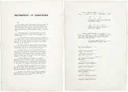 - Actes de capitulation de l'Allemagne, signés le à Reims, valable pour le seul front de l'ouest ; le , à Berlin, les représentants du Reich confirment leur reddition sur l'ensemble des théâtres d'opérations sur lesquels des unités allemandes sont engagées.