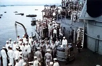 La signature des accords dura 23 minutes et fut diffusée à travers le monde. Le premier signataire, Mamoru Shigemitsu, ministre japonais des Affaires étrangères, ratifia le traité sur l'ordre et au nom de l'Empereur du Japon et du gouvernement japonais. Puis Yoshijirō Umezu, chef d'état major de l'armée impériale japonaise, sur l'ordre et au nom du Quartier général impérial. Ensuite, le Général américain Douglas MacArthur, commandant du Sud-Ouest Pacifique et commandant suprême des forces alliées, signa également.