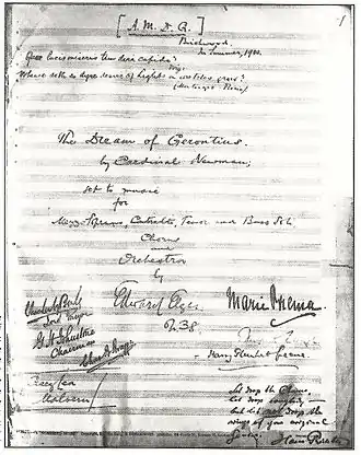 - En 1900, Edward Elgar utilise A.M.D.G. comme dédicace de sa mise en musique du poème du cardinal Newman intitulé The Dream of Gerontius (Le rêve de Géronte) ;