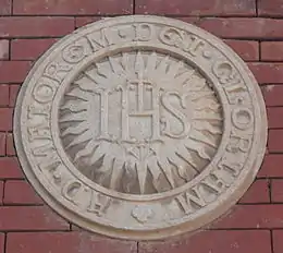 - lorsque Ignace de Loyola est représenté tenant un livre, la locution ou le sigle est souvent inscrit sur le livre ; par exemple en Inde, dans l'état du Jharkhand dans la ville de Jamshedpur, une statue en bronze d'Ignace de Loyola se trouve au milieu du jardin du cloître de l'école Loyola (en)[10] représenté portant un livre sur lequel est écrit Omnia ad majorem Dei gloriam ;