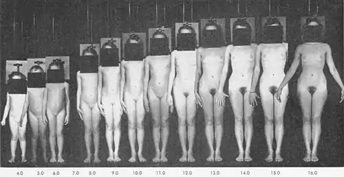 Ainsi, les seins de la jeune fille sont au stade 3 de l'échelle de Tanner lorsque les premières règles sont observées[29]. L'échelle de Tanner décrit les modifications physiques des caractères sexuels secondaires qui ont lieu pendant la puberté et décrites par les cinq stades de Tanner nommés d'après le pédiatre britannique James Tanner qui a mis au point le système de catégorisation.