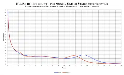 Au cours du pic de vitesse de croissance (le moment où la croissance est la plus rapide), les adolescents grandissent à un taux de croissance à peu près identique à celle d'un très jeune enfant : environ 10.3 cm pour les jeunes hommes et 9 cm pour les jeunes filles sur un an[32].