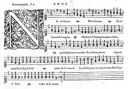 La musique est imprimée d'après la technique initiée à Paris par Pierre Attaingnant (en simple impression, chaque type portant un segment de portée), avec des caractères fondus par les tailleurs Guillaume I Le Bé et Robert Granjon. Le matériel typographique[1] est riche d'une dizaine de caractères de musique, de plain-chant ou de tablature, répartis en trois corps :