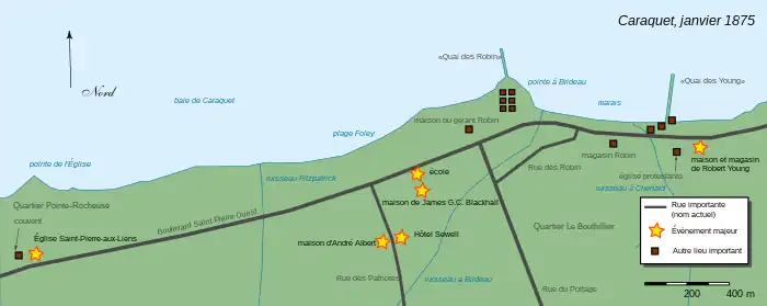 Pendant environ cinquante ans, les deux groupes se détestent et aucun mariage n'est célébré entre les deux groupes de familles fondatrices[19]. Au début du XIXe siècle, la présence des pêcheurs attira un troisième groupe d'habitants, anglophones et protestants cette fois, provenant du Royaume-Uni et de Jersey. Le nombre augmente à l'arrivée de la Charles Robin Company en 1837[20]. Les marchands s'installent dans le centre de la ville et construisent magasins, hangars et grandes maisons, des quais et autres infrastructures portuaires. En 1871, lors de l'éclatement de la question des écoles, Caraquet compte 3 111 habitants, dont 79 anglophones[20].