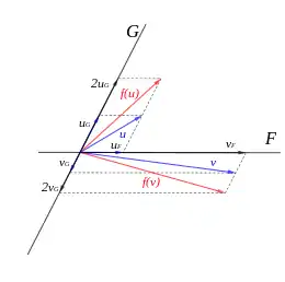 l'affinité de base ou sur , de direction , et de rapport est l'unique endomorphisme qui, restreint à , égale l'identité, et restreint à , égale l'homothétie de rapport :