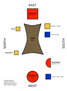 Les rituels védiques sont généralement exécutés par quatre prêtres : l’adhvaryu qui est responsable des détails matériels du sacrifice et chante le Yajurveda, un hotṛi qui récite le Rigveda, un udgātṛi qui chante les hymnes du Samaveda et un brahman qui supervise la cérémonie et récite l'Atharvaveda tout en corrigeant les erreurs qui peuvent survenir. Il y a trois feux : un feu offert à l'est appelé āhavanīya allumé dans un brasero carré, un feu à l'ouest appelé le gārhapatya allumé dans un brasero circulaire, qui représente le feu du maître de maison, et un feu au sud simplement appelé le dakṣiṇāgni (feu du sud). Pendant les cérémonies, un tisonnier, un pot appelé agnihotrasthālī, une cuillère connue sous le nom de sruva et une grande louche appelée agnihotrahavani sont tous utilisés. Au centre de l'espace rituel se trouve un autel en terre appelé le vedi, où sont placés les outils pour effectuer le rituel[7].