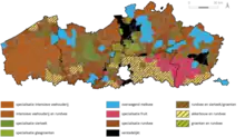 Le secteur agricole flamand est composite et connaît une hétérogénéité selon les régions comme l'illustre la carte de caractérisation agricole classifiant les communes présentant une activité agricole similaire. Les régions typiques sont ainsi reconnaissables : les fruits autour de Saint-Trond et les légumes autour de Wavre-Sainte-Catherine, Roulers et Hoogstraten. On retrouve l’horticulture autour de Gand. L’élevage porcin se concentre en Flandre-Occidentale, dans le Meetjesland, le pays de Waes et la Campine. L’élevage laitier est important dans les Ardennes flamandes et le Pajottenland, mais aussi en combinaison avec l’amélioration génétique en Campine. L’élevage bovin se retrouve surtout dans la région de Bruges, le sud de la Flandre-Occidentale et de la Flandre-Orientale et en combinaison avec les cultures dans le Brabant flamand et le sud du Limbourg.