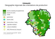 Depuis longtemps, l'élevage représente la majorité de l'agriculture régionale, principalement grâce aux races limousines. En effet, cette région (comme la Corse, l'Aveyron, etc.) possède ses races qui portent haut le nom de leur région d'origine: bœuf limousin, mouton limousin et porc cul-noir du Limousin.