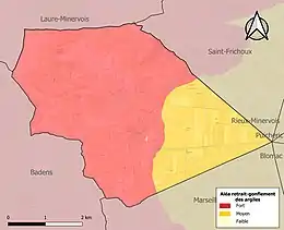 Le retrait-gonflement des sols argileux est susceptible d'engendrer des dommages importants aux bâtiments en cas d’alternance de périodes de sécheresse et de pluie. La totalité de la commune est en aléa moyen ou fort (75,2 % au niveau départemental et 48,5 % au niveau national). Sur les 332 bâtiments dénombrés sur la commune en 2019, 332 sont en aléa moyen ou fort, soit 100 %, à comparer aux 94 % au niveau départemental et 54 % au niveau national. Une cartographie de l'exposition du territoire national au retrait gonflement des sols argileux est disponible sur le site du BRGM[24],[Carte 3].