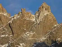 Vue du versant Nord-Ouest de l'aiguille de Blaitière avec, à sa droite, les Ciseaux et le Fou. | |||