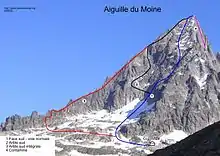 Jean Charlet-Straton, Joseph Simond, Isabella Straton et Emmeline Lewis Lloyd en ont fait la première ascension le [3]. La voie normale est en face sud par le glacier du Moine. Il existe aussi des voies en face Est et en face Ouest.