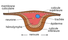 Les nervures (ou veines) sont des structures creuses tubulaires formées par le couplage des parois supérieures et inférieures de l'aile. Les plus grosses veines sont des voies de passage de l'hémolymphe, des systèmes trachéaux et nerveux (neurones des organes sensoriels)[1]. L'aile de l’insecte, contrairement à une croyance répandue, n'est donc pas un organe mort et sec[2] : les trachées apportent de l'oxygène, l'hémolymphe fournit des nutriments et des hormones nécessaires au métabolisme des neurones, et de l'eau pour maintenir l'élasticité et la dureté de l'aile. Les organes sensoriels sont principalement des mécanorécepteurs qui interviennent dans le contrôle du mouvement des ailes et de la stabilisation du corps en vol (détection des distorsions de la cuticule). Chez certains insectes, des mécanorécepteurs sensibles aux vibrations pour détecter des prédateurs et servant à la communication intraspécifique. Il existe également des chimiorécepteurs (en lien avec le toilettage[3], le contrôle des qualités nutritives des sources du nectar[4] et les thermorécepteurs (protection contre la surchauffe)[5].
