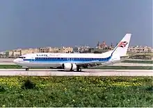 Un Boeing 737-400 d'Air Uk Leisure à l'aéroport international de Malte au milieu des années 1990.