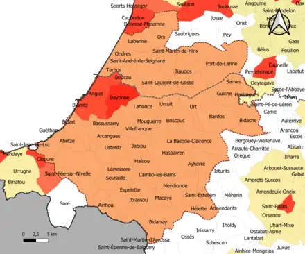 | Communes de la couronne | Pyrénées-Atlantiques | 37 | Ahetze, Ainhoa, Arbonne, Arcangues, Ayherre, Bardos, Bassussarry, Bidache, Bidarray, Bidart, Bonloc, Briscous, Cambo-les-Bains, Espelette, Guéthary, Guiche, Halsou, Hasparren, Hélette, Itxassou, Jatxou, La Bastide-Clairence, Lahonce, Larressore, Louhossoa, Macaye, Mendionde, Mouguerre, Saint-Jean-de-Luz, Saint-Pée-sur-Nivelle, Saint-Pierre-d'Irube, Sames, Souraïde, Urcuit, Urt, Ustaritz, Villefranque. |