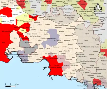 | Nombre de communes | 115 soit 80 (Bouches-du-Rhône) + 22 (Var) + 13 (Vaucluse)) |