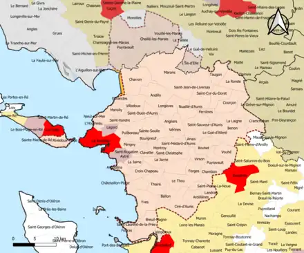 Communes de la couronneCharente-Maritime63Aigrefeuille-d'Aunis, Anais, Andilly, Angliers, Angoulins, Ardillières, Ballon, Benon, Bouhet, Bourgneuf, Chambon, Charron, Châtelaillon-Plage, Ciré-d'Aunis, Clavette, Courçon, Cram-Chaban, Croix-Chapeau, Dompierre-sur-Mer, Esnandes, Ferrières, Forges, Fouras, La Grève-sur-Mignon, Le Gué-d'Alleré, L'Houmeau, La Jarne, La Jarrie, La Laigne, Landrais, Longèves, Marans, Marsilly, Montroy, Nieul-sur-Mer, Nuaillé-d'Aunis, Périgny, Puilboreau, Puyravault, Rivedoux-Plage, La Ronde, Saint-Christophe, Saint-Cyr-du-Doret, Saint-Jean-de-Liversay, Saint-Laurent-de-la-Prée, Sainte-Marie-de-Ré, Saint-Médard-d'Aunis, Saint-Ouen-d'Aunis, Saint-Rogatien, Saint-Sauveur-d'Aunis, Sainte-Soulle, Saint-Vivien, Saint-Xandre, Salles-sur-Mer, Taugon, Thairé, Le Thou, Vergeroux, Vérines, Villedoux, Virson, Vouhé, Yves.