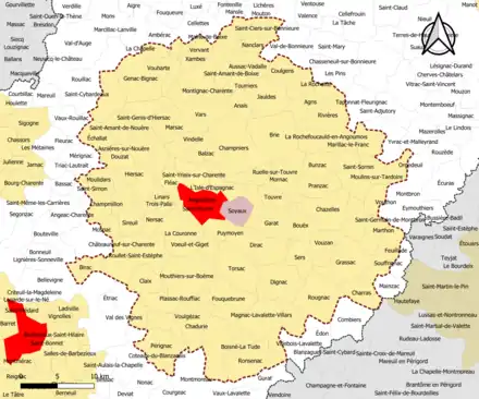 Localisation de l'aire d'attraction d'Angoulême dans le département de la Charente. | |