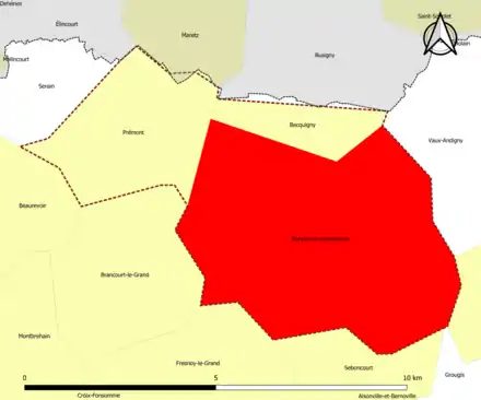 | Becquigny | 02061 | Aisne | commune de la couronne | 4,67 | 258 (2021) | 55 | |