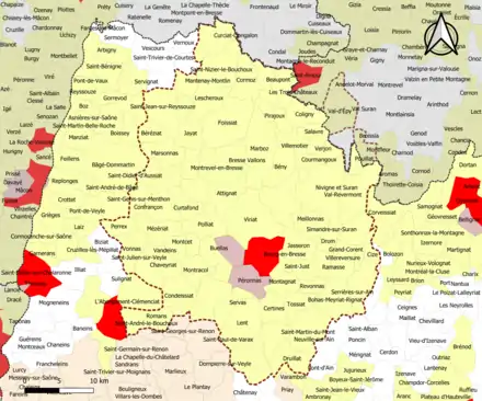 Localisation de l'aire d'attraction de Bourg-en-Bresse dans le département de l'Ain. | |