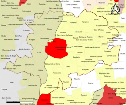 | Rochemaure | 07191 | Ardèche | commune de la couronne | 24,33 | 2 264 (2021) | 93 | |