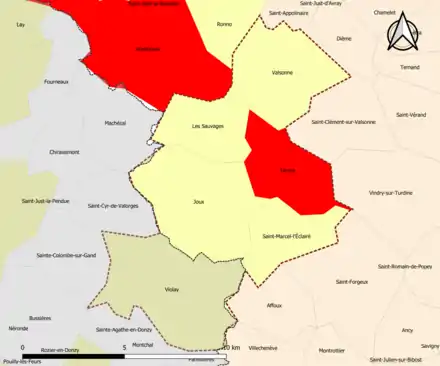 | Joux | 69102 | Rhône | commune de la couronne | 25,18 | 751 (2021) | 30 | |