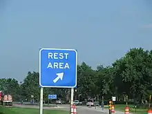 Aux États-Unis, les panneaux d'aires de services sont avec un fond bleu (à ne pas confondre avec les panneaux indiquant les commerces situés à une sortie) et indiquent le nom de l'aire de service, les services (texte ou pictogramme) et les noms des tenanciers des services. Généralement, une aire de service est présignalisée à 10, 5 et 1 miles (16, 8 et 1,6 km) ainsi qu'à l'aire de service précédente.
